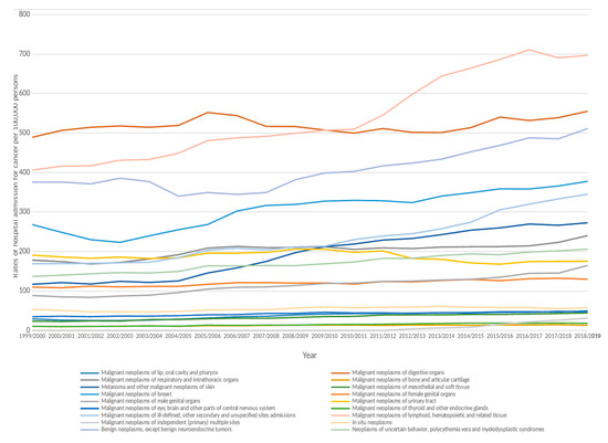 To calculate the annual hospital admissions rate for neoplasms, we collected mid-year population data between 1999 and 2019 from the Office for National Statistics. Annual hospital admission rates for males were calculated using the number of hospital admissions related to each type of neoplasm for each age group among males divided by the mid-year population for males of the same age group of the same year. A similar procedure was followed to calculate the annual hospital admission rates for females.