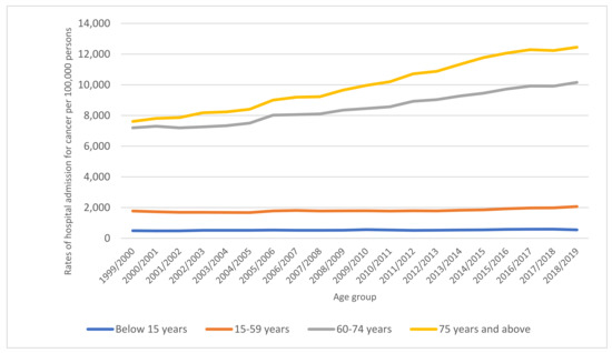 The UK continues to nurture cancer awareness and screening programs. These initiatives have increased the number of patients diagnosed at the early stages and improved survival outcomes [7]. Despite this, there are many late-diagnosed cancer cases. Moreover, many patients are diagnosed with cancer during hospitalisation. Admission rates are important measures for healthcare monitoring and assessing interventions’ outcomes [8]. Admission rates are mainly influenced by the number of new cases of diseases, which is an essential measure of healthcare quality [8]. There is a paucity of studies exploring recent trends in cancer admissions, and most previous studies have focused on specific populations or particular diseases [9,10,11]. In England, Wales, and Northern Ireland, Ostermann et al. reported that the mortality and length of stay have decreased in patients with haematologic and solid cancers who had unplanned ICU admissions between 1997 and 2013. The study identified age, severity of illness, metastasis, and previous admission history as independent risk factors for increased hospital mortality [12]. Therefore, in our study, we aimed to investigate the trends in neoplasm-related hospital admissions (NRHA) in England and Wales between 1999 and 2019. Unlike prior studies, this analysis gives a comprehensive estimate of the trends in admissions related to all types of cancer, with no restrictions on the type of cancer being investigated. This will provide decision makers with a clear picture of the current situation regarding cancer and its hospitalisation trends, allowing them to better plan for its management.