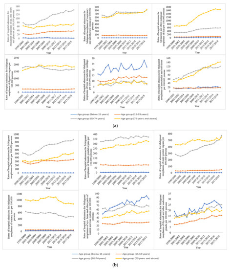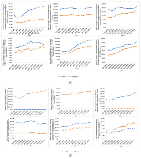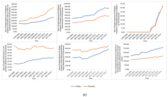 (a) Hospital admission rates for neoplasms in England and Wales stratified by gender between 1999 and 2019; (b) Hospital admission rates for neoplasms stratified by gender (continued); (c) Hospital admission rates for neoplasms stratified by gender (continued).