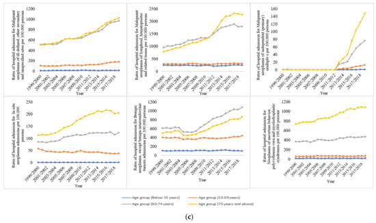 (a) Hospital admission rates for neoplasms in England and Wales stratified by age group between 1999 and 2019; (b) Hospital admission rates for neoplasms stratified by age group (continued); (c) Hospital admission rates for neoplasms stratified by age group (continued).