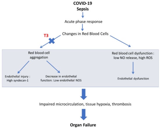 - Pantos, C.; Apostolaki, V.; Kokkinos, L.; Trikas, A.; Mourouzis, I. Acute triiodothyronine treatment and red blood cell sedimentation rate (ESR) in critically ill COVID-19 patients: A novel association? Clin. Hemorheol. Microcirc. 2021, 79, 485–488. [Google Scholar] [CrossRef]