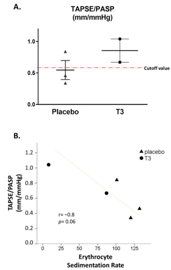 Here, from the same patients included in Thy-Support, we provide additional findings probably indicating a novel effect of LT3 treatment on functional indices of the right ventricle (RV) in ICU COVID-19 patients. RV dysfunction is detected in nearly 39% of COVID-19 patients and is associated with a worse prognosis [77]. RV dysfunction appears to be prominent in patients with elevated troponin, indicating poor tolerance of overloaded RV to tissue hypoxia [30]. In the Thy-Support study, echocardiography was used to assess functional indices in ICU patients with COVID-19 [8]. The tricuspid annular plane systolic excursion (TAPSE) to systolic pulmonary artery pressure (PASP) ratio was used as an index of coupling of RV to pulmonary artery circulation. This index seems to be an independent predictor of survival in COVID-19 ARDS [78]. Furthermore, in a cohort of 133 COVID-19 patients who underwent full echocardiographic analysis and follow-up, the best cut-off for predicting in-hospital mortality was the TAPSE/PASP ratio < 0.57 mm/mmHg and associated with more than a 4-times increased risk of death [79]. In the Thy-Support study, the TAPSE/PASP ratio was found to be above the cut-off of 0.57 mm/mmHg in patients treated with LT3. Figure 2A. In fact, the TAPSE/PASP ratio 48 h after treatment was 0.85 (0.18) in the LT3 group vs. 0.55 (0.15) in the placebo group, p = 0.3. Furthermore, a strong inverse correlation was found between the ESR and TAPSE/PASP ratio at 48 h (r = −0.8, p = 0.06); see Figure 2B. Left ventricular function was not abnormal, and it was comparable in the two groups (LVEF% was 60% (3.0) for LT3-treated patients and 65% (5.0) for the placebo, p = 0.31).