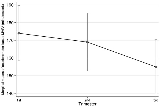 Accelerometer-based moderate-to-vigorous physical activity (MVPA) by trimester. Notes: The error bars represent 95% confidence intervals of the corresponding point estimates.