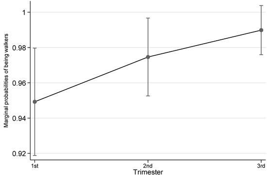 Probability of being walkers by trimester. Notes: The error bars represent 95% confidence intervals of the corresponding point estimates.