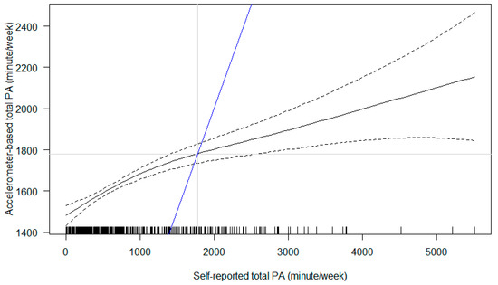 Association between self-reported total physical activity (PA) and accelerometer-based total PA. Notes: The black solid line represents point estimates (and the black dashed lines their 95% confidence intervals). The blue line is a reference line to indicate the hypothesised absolute agreement between two measures.