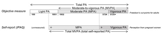 Commonly, physical activity is measured subjectively by self-reports or objectively using wearable devices. Self-reports such as self-administered questionnaires provide perception-based physical activity estimates accounting for the variation across trimesters in pregnant women. Although the physical activity intensity can reflect personal physical capability, subjective bias is inevitable [2,3]. Wearable devices that automatically capture different intensities of physical activity undertaken by pregnant women allow for more accurate estimates [4]. The quality of estimation relies on the intensity category (e.g., cut-points) appropriate for specific populations [5]. To date, physical activity intensity classification established for pregnant women is not available and the cut-points for general adults are commonly used for pregnant women [6]. It is important to understand the relationship between physical activity measured by these two methods to inform the establishment of device-based intensity classification for pregnant women and thus potential physical activity prescription by clinicians.