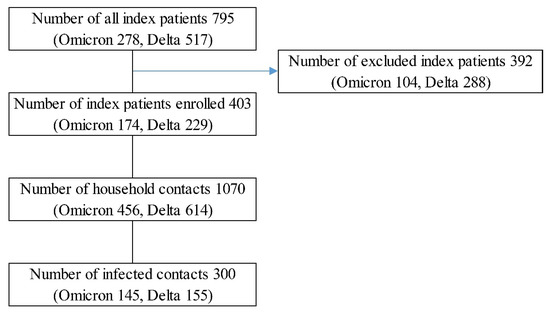 Table 1 and Figure 1 show the periods and enrollment. This study enrolled 1070 contacts from 403 households, and 70% of SARS-CoV-2 infections were confirmed using polymerase chain reaction tests (Table 1). The proportion of enrolled index patients in the delta variant-dominant period is smaller than that in the omicron variant-dominant period (Figure 1) because of the relatively large proportion of single households due to several outbreaks in dormitories for high school students and for foreign workers.