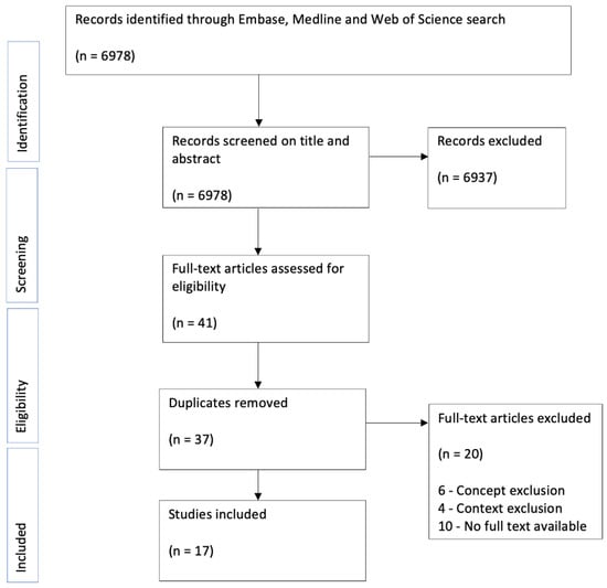 The search strategy identified 6978 records across the three databases searched (Figure 1). After removing duplicates, these records were then screened for eligibility using the titles and abstracts, by which 37 were selected for full text review. From these 37, a total of 17 met the inclusion criteria and were included. For the list of studies selected, see Appendix A. The reasons for excluding the 20 articles at the full text review were based on either the concepts in the text not meeting the inclusion criteria, the context of the text meeting the exclusion criteria or no full text being available. The number of studies excluded for each of these reasons is charted in Figure 1—ten studies were excluded because there was no full text available, six because their concept did not focus on saddle sores or PNIs, and four studies because their focus was on urological issues rather than dermatological issues.
