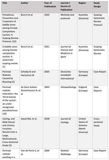 The research team included (D.N.) and (N.H.). After discussion, the team decided that a broad research question was needed to highlight the gaps in the research regarding saddle sores. The justification was given that there was a lack of robust evidence available on saddle sores in the literature, given the results of a preliminary search and the recommendations of a recent systematic scoping review []. Our research question was: What is the state of current evidence on the prevalence, prevention and management of saddle sores in cycling?