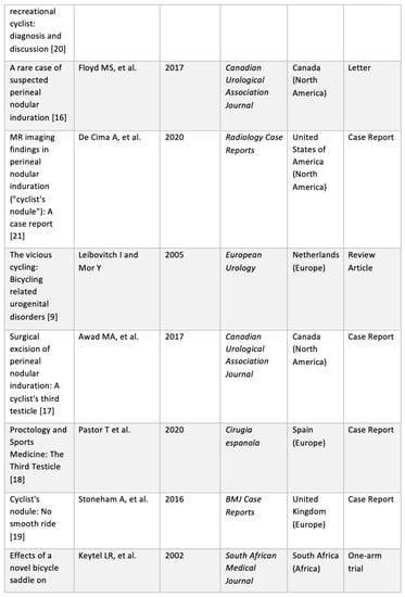 - Scheiba, N.; Hartschuh, W. Perineal Nodules Caused by Bicycling. Dtsch. Ärzteblatt Int. 2020, 117, 100. [Google Scholar] [CrossRef]