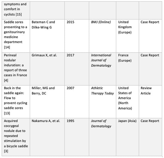 In the literature identified, saddle sores and PNIs were almost exclusively reported in males. The main theme emerging from case studies was that men between 40 and 70 were the most represented (see Table 1). However, we accept that this likely represents publication bias [] and the author has observed how cyclists of all ages and sexes are affected by saddle sores from experience working in cycling. Younger people can be affected, with one case study describing incidence of the condition in four teenage males in Japan [].The case studies do not provide any reports of cases in females. Saddle sores are reportedly common in females according to a recent systematic review [], but this was not evident from the literature, likely representing publication bias []. This scoping review has further highlighted the lack of research in female cyclists’ saddle-sore issues and this requires further investigation [].