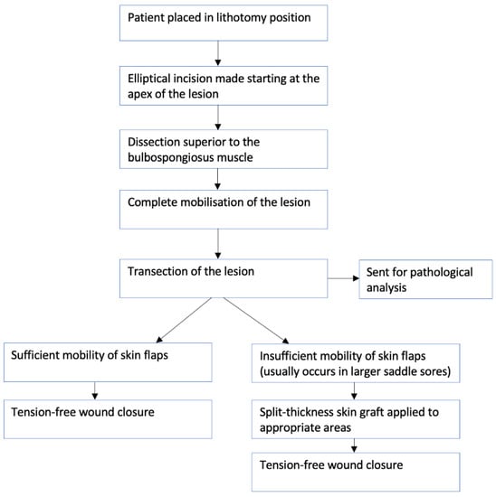 Flow diagram summarising the surgical excision technique reported by Awad et al. [] in a 48-year-old male cyclist, describing the stages involved.