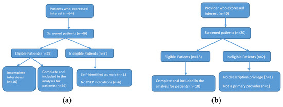 Once study subjects passed eligibility screening and provided the consent form, semi-structured interviews were conducted by ZOOM or by phone, based upon the individual’s preference. We used either a Health Insurance Portability and Accountability Act (HIPAA)-compliant digital recorder or HIPAA-compliant ZOOM with participants’ consent to record interviews. Overall, a total of 64 patients were contacted by the research team, 46 proceeded to eligibility screening, and 29 completed the interview. For providers, 40 contacted the research team, 20 were screened, and 18 were eligible and completed the interview (Figure 1a,b).