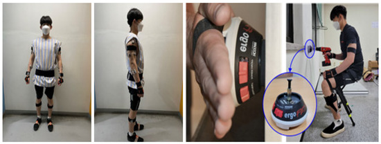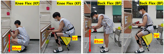 This study used a passive lower-limb exoskeleton called CEX developed by the Hyundai Motor Group (Seoul, Korea), which can be adjusted to seating angles of 55, 70, and 85°. Before the experiment, each participant had sufficient adaptation time to conduct tasks stably while wearing the CEX. Most of the participants set the angles to 55° for the knee flexion posture and 70° for the back flexion posture, as shown in Figure 1.