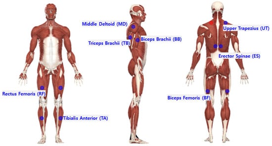 The TeleMyo 2400 DTS System (Noraxon, AZ, USA) was used to measure loads on muscles with and without the lower-limb exoskeleton CEX. Electrodes and sensors were attached to 16 muscle locations, on the left and right sides of 8 muscles, as measured in previous exoskeleton studies [15,24,25,26]. The upper-limb muscles of the middle deltoid (MD), biceps brachii (BB), triceps brachii (TB), and upper trapezius (UT); lumbar muscles of the erector spinae (ES); and rectus femoris (RF), tibialis anterior (TA), and biceps femoris (BF) were selected for monitoring, as illustrated in Figure 2. The electrode attachment position of each muscle was selected based on the guidelines of the surface EMG for the non-invasive assessment of muscles (SENIAM) [27]. Data were collected at 1500 Hz, and band-pass filtering at 20–400 Hz was performed for EMG analysis. Then, smoothing was performed by root-mean-square (100 ms). Since the intensity of the signal was different for each subject and muscle, the EMG was normalized by %MVC, a commonly used method in previous studies (Equation (1)) [28]: