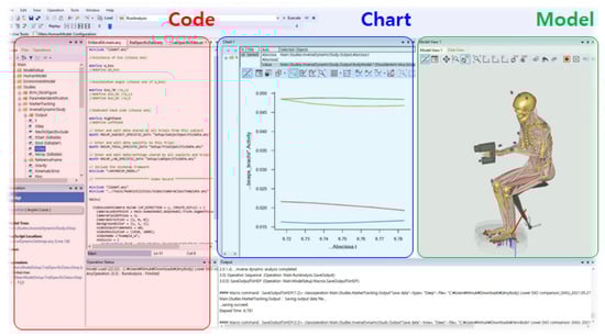 The Code integrates anthropometric information, motion data, the magnitude of external forces, and information on objects that combine and interact with the body. Motion data collected using the motion capture IMU sensors can be identified in the Code part of the software. This modification of the human model, input external force, and combined segment and body can also be performed through additional code modification input. The Chart shows time-series data, such as muscle activity and biomechanical data. The Model shows a visualized human model that provides various angles of body segments. The Model also can play or record motions.