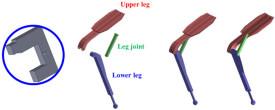 Models of the drill and exoskeleton were designed using 3D computer-aided design (CAD) modeling, and conversion was performed by a plug-in, which was supported by AMS. The lower-limb exoskeleton consists of three parts (upper leg, lower leg, and a leg joint), and both sides were designed symmetrically. To implement mechanical movement, constraints were added the same way as the actual operation mechanism. Due to the coupling parts of the upper leg, lower leg, and leg joint rotating the hinge only, the movement was limited, except for the rotational motion in the corresponding direction. One end of the leg joint inserted into the groove of the upper leg only moved back and forth along the groove; a simple driver was used to limit movement, except for translational motion in the corresponding direction. Finally, the seating angle between the upper and the lower legs could be adjusted in the range 55–85°, the same as the CEX exoskeleton (Figure 5).