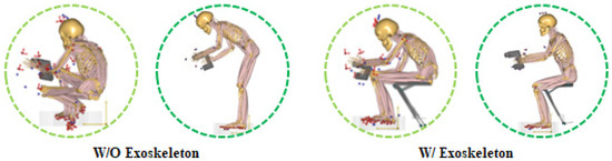 The drill was coupled to a glove node located in the hand of the human model through a standard point, and the external drilling force measured through a push–pull gauge was added to a tip node. The exoskeleton was located 3 cm away from the tuber node of the pelvis to combine a large part of the upper leg and the hip. The muscle activities of the eight muscles that were monitored with the EMG were calculated using AMS to estimate the muscle loads with and without the lower-limb exoskeleton (Figure 6).