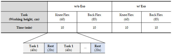 EMG electrodes were attached to the specified 16 locations (8 muscles, left/right) for EMG data measurement. After measuring the resting EMG and MVC, the participants performed four tasks (w/o Exo and w/ Exo at two working heights) for 10 min each. All tasks were randomized for each participant, and each task was repeated ten times with a 40 s bolting task and a 20 s break time (Figure 7). Finally, Xsens IMU sensors were attached to 17 body parts, and calibration was performed to collect motion data.