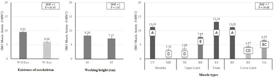 As a result of the muscle activities measured by EMG, the main effects of wearing the exoskeleton, working height, and muscle type were statistically significant (all p < 0.05). Figure 8, left shows that when wearing the exoskeleton, the muscle activity (6.06% MVC) was 36.3% lower than when not wearing it (9.51% MVC). Figure 8, middle shows that when working at 85 cm (back flexion posture; BF_85), the muscle activity (7.27% MVC) was 12.3% lower than that (8.29% MVC) at the working height of 60 cm (knee flexion posture; KF_60). Figure 8, right shows that in terms of muscle type, UT, ES, and BF showed the highest muscle activity, while TB, MD, and RF showed the lowest muscle activity.