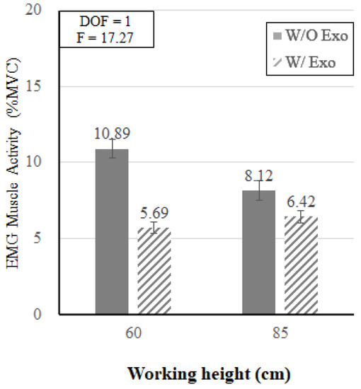 Figure 14 shows that the interaction effect of wearing the exoskeleton and working height was also statistically significant (p < 0.05). In the knee flexion posture (KF_60), the muscle activity decreased by 23.9% when wearing the exoskeleton (w/o Exo: 7.87% MVC, w/ Exo: 5.99% MVC); while in the back flexion posture (BF_85), the muscle activity decreased by 9.21% when wearing the exoskeleton (w/o Exo: 6.19% MVC, w/ Exo: 5.62% MVC).