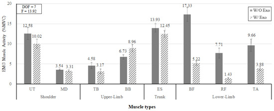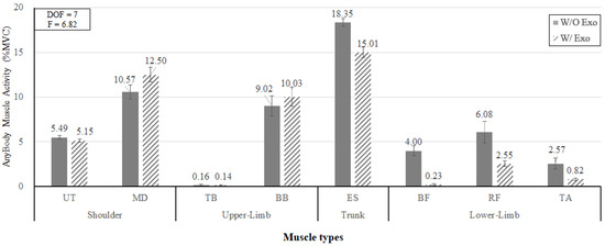 Figure 15 shows that the interaction effect of wearing the exoskeleton and muscle type was also statistically significant (p < 0.05). The muscle activity (18.35% MVC) of the lumbar muscle (ES) w/o Exo decreased to 15.01% MVC when wearing the lower-limb exoskeleton. The muscle activities of the lower extremity (BF, RF, TA) also showed decreasing trends of muscle loads (i.e., 4.0% MVC, 6.08% MVC, and 2.57% MVC w/o Exo vs. 0.23% MVC, 2.55% MVC, and 0.82% MVC w/ Exo, respectively).