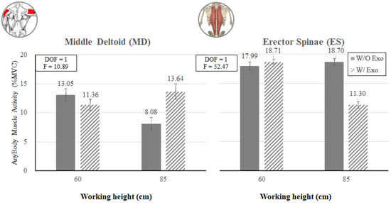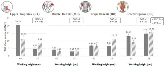 On the other hand, this trend was reversed when working at 85 cm. When working at 85 cm, the muscle activity of the upper extremity (MD) increased by 68.8% (8.08% MVC vs. 13.64% MVC for w/o Exo vs. w/ Exo), whereas the muscle activity of the lumbar (ES) decreased by 39.6% when wearing the exoskeleton (18.70% MVC vs. 11.30% MVC for w/o Exo vs. w/ Exo).