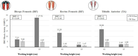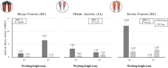 Figure 12 shows that the muscle activities of the lower extremity (BF, RF, and TA) tended to decrease when wearing the exoskeleton, regardless of the working height. For example, at the back flexion posture (BF_85), the muscle activity of BF decreased by 82.38% when wearing the exoskeleton, whereas at the knee flexion posture (KF_60), the muscle activities of RF and TA decreased by 89.46% and 70.71%, respectively, when wearing the exoskeleton (p < 0.05).