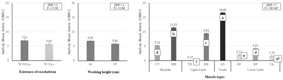 The main effects of wearing the exoskeleton (left), working height (middle), and muscle type (right) on EMG muscle activity. Different letters indicate significant statistical differences (p < 0.05, Tukey’s test).
