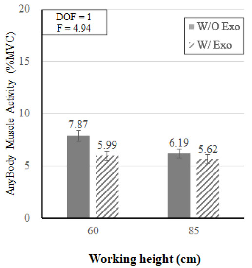 As a result of the muscle activities estimated by AMS, the main effects of wearing the exoskeleton, working height, and muscle type were found to be statistically significant (all p < 0.05). Similar to the results of the experimental EMG assessment (Figure 8), when wearing the exoskeleton, the estimated muscle activity (5.80% MVC) was 17.5% lower than when not wearing it (7.03% MVC). When working at 85 cm, the muscle activity (5.90% MVC) was 14.9% lower than that (6.93% MVC) at the working height of 60 cm (Figure 13, left and middle).