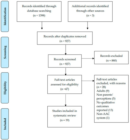 The search yielded 1398 articles distributed over time as shown in Figure 1. After the removal of duplicates, 927 titles remained. Of these, 880 studies were excluded after the title and abstract screening, as they did not fulfill the eligibility criteria. Of the 47 studies that were full-text screened, 28 did not meet the inclusion/exclusion criteria. Specifically, 9 studies were excluded as they included adults (>18) in the sample of participants, 5 studies were excluded as parents’ perceptions were not reported, 13 studies were excluded as qualitative methodology was not used, and finally, 1 study was excluded as AAC systems were not employed.