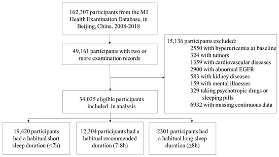 This longitudinal study aimed to explore the association of sleep duration with hyperuricemia among Chinese adults. This study was based on the MJ Health Examination Database in Beijing, China. The details of the database can be found online [24]. We included participants over 18 without prevalent hyperuricemia at baseline that had two or more examinations from 1 January 2008 to 31 December 2018. We excluded subjects with tumors, cardiovascular diseases, kidney diseases, mental illness, or those taking psychotropic drugs or sleeping pills. In addition, we also excluded participants with missing key covariables, including sleep duration, Serum UA, age, sex, and Body Mass Index (BMI). Finally, 34,025 participants remained in the study (Figure 1).