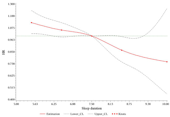 After adjusting for demographic factors, habits, and metabolism-related covariates (Model 3), HR was 1.07 (95%CI: 1.01–1.14) for short sleep duration and 0.85 (95%CI: 0.74–0.97) for long sleep duration. Adding adjustment of white blood cell amount, HR was 1.07 (95%CI: 1.00–1.13) for short sleep duration with marginal significance and 0.84 (95%CI: 0.74–0.97) for long sleep duration in Model 4. All four models showed a significant inverse trend (p for trend < 0.001) (Table 2). No significant nonlinearity was detected based on restricted cubic spline (Figure 2, p for nonlinearity > 0.05) In the additional sensitivity analyses, the results remained unchanged (shown in Table A1). In the five-category sleep duration analysis, a significant inverse trend (p for trend < 0.001) was also observed in all four models (shown in Table A2).