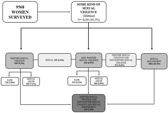 Of the women who responded, 44.5% had experienced some kind of violence (PSV, NPSV or SH) and 1.5% had experienced all three of the kinds analyzed here. Bearing in mind the serious impact of sexual violence on health [5,48], this form of violence, in any of its types, ought to be more present in research on gender-based violence.