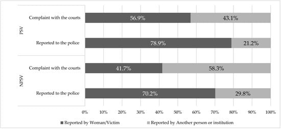 In 78.9% of cases it was the woman herself who reported the assault to the police and in 21.2% it was another person or institution. In the case of judicial complaints, in 56.9% of cases it was the woman herself who filed suit against her partner or ex-partner and in 43.1% it was another person or institution (Figure 2, PSV).