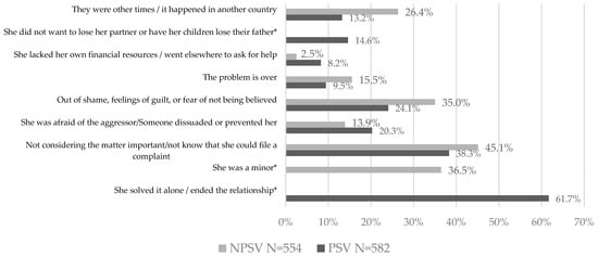 Reasons for not filing a police report or judicial complaint of PSV and NPSV. * Some answers do not apply for a certain group of women, so the data is not shown.