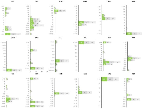 The MIC value distribution of 18 antibiotics against 29 strains of Streptococcus spp. isolated from olive flounders. The X and Y axes of the graph represent the number of isolates and the MIC (μg/mL), respectively. The results of the experiment repeated in triplicate are shown in colour on the graph (1st: green, 2nd: dark gray, 3rd: light gray). Oxytetracycline: OXY; ceftiofur: XNL; flumequine: FLUQ; enrofloxacin: ENRO; neomycin: NEO; ampicillin: AMP; amoxicillin/clavulanic acid: AUG2; doxycycline: DOX; trimethoprim/sulfamethoxazole: SXT; sulfisoxazole: FIS; azithromycin: AZI; ciprofloxacin: CIP; clindamycin: CLI; erythromycin: ERY; florfenicol: FFN; gentamicin: GEN; nalidixic acid: NAL; tetracycline: TET.