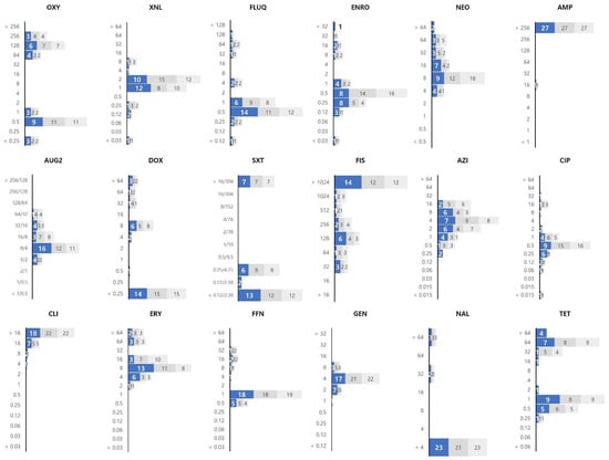 The MIC value distribution of 18 antibiotics against 28 strains of Vibrio spp. isolated from olive flounder. The X and Y axes of the graph represent the number of isolates and the MIC (μg/mL), respectively. The results of the experiment repeated in triplicate are shown in colour on the graph (1st: blue, 2nd: dark gray, 3rd: light gray). Oxytetracycline: OXY; ceftiofur: XNL; flumequine: FLUQ; enrofloxacin: ENRO; neomycin: NEO; ampicillin: AMP; amoxicillin/clavulanic acid: AUG2; doxycycline: DOX; trimethoprim/sulfamethoxazole: SXT; sulfisoxazole: FIS; azithromycin: AZI; ciprofloxacin: CIP; clindamycin: CLI; erythromycin: ERY; florfenicol: FFN; gentamicin: GEN; nalidixic acid: NAL; tetracycline: TET.