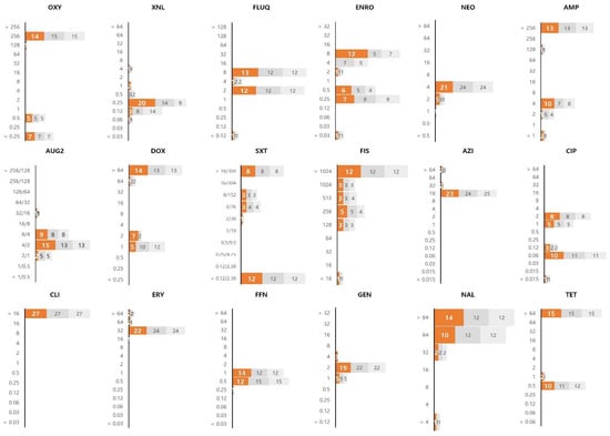 The MIC value distribution of 18 antibiotics against 27 strains of Edwardsiella piscicida isolated from olive flounders. The X and Y axes of the graph represent the number of isolates and the MIC (μg/mL), respectively. The results of the experiment repeated in triplicate are shown in colour on the graph (1st: orange, 2nd: dark gray, 3rd: light gray). Oxytetracycline: OXY; ceftiofur: XNL; flumequine: FLUQ; enrofloxacin: ENRO; neomycin: NEO; ampicillin: AMP; amoxicillin/clavulanic acid: AUG2; doxycycline: DOX; trimethoprim/sulfamethoxazole: SXT; sulfisoxazole: FIS; azithromycin: AZI; ciprofloxacin: CIP; clindamycin: CLI; erythromycin: ERY; florfenicol: FFN; gentamicin: GEN; nalidixic acid: NAL; tetracycline: TET.
