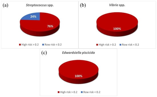 Classification of isolates by MAR index. High risk (red area) means that the isolate has a MAR index greater than 0.2 derived from a high-risk source of antibiotic contamination [23]: (a) Streptococcus spp.; (b) Vibrio spp.; (c) Edwardsiella piscicida.