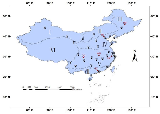 Distribution of the large tourist cities in this study. The cities with red color are used for exploring optimal methods on solar radiation estimation, and the cities with black color are the other tourism cities in this study. Roman numerals indicate the climate zones in China. I denotes the temperate and warm-temperate deserts of northwest China, II Inner Mongolia, III the temperate humid and sub-humid northeastern China, IV the temperate humid and sub-humid northern China, V the subtropical humid central and southern China, VI the Qinghai–Tibetan Plateau, and VII the tropical humid southern China. Whole names of the cities can be seen in Table 1.