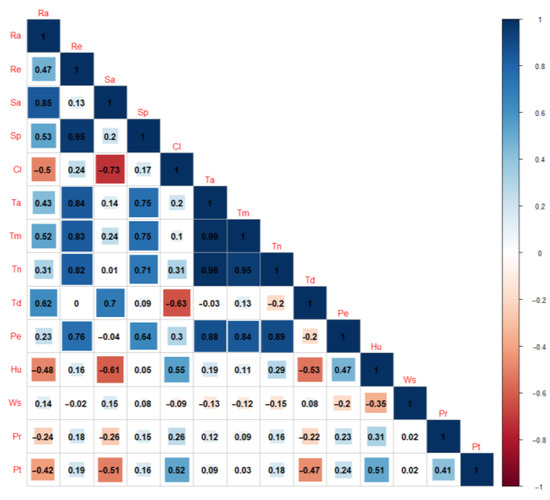 where Ra is the observed daily solar radiation, Re the extra-terrestrial solar radiation, S the observed sunshine hours, and S0 the potential sunshine hours, respectively. Re and S0 can be calculated with the method recommended by FAO [48].