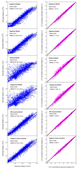 The empirical coefficients of a, b and c in Equations (7)–(10) were fitted by numerical iteration methods [53]. The BP and SVM methods were implemented through the “nnet” and “e1071” packages in R language, respectively. A regression task was involved in the study, and both the empirical models and the machine-learning methods were calibrated and validated before application. The machine-learning methods are believed to be more accurate in radiation estimation than the empirical models [41], but they require big data for model training. In contrast, the empirical models are easy to operate, and require less data for model calibration than the machine-learning methods.