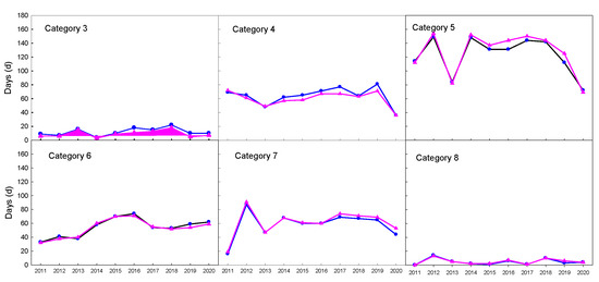 Distribution probability of the days within each category in the period of 1961–1990 (black lines) and 1991–2020 (red lines).