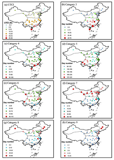 3.2. Spatial Analysis of UTCI and Day Number within Each Category