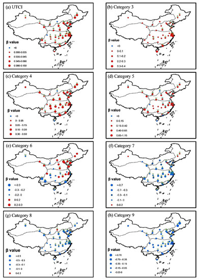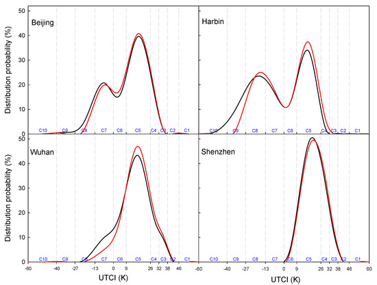 The general spatial distribution of UTCI in the tourism cities of China is comparable to the previous reports [9,44], with quantitative differences due to different strategies on dealing with input variables. In the future, error in UTCI calculation caused by using cloudiness [9] or simple interpolation [44] should be examined deliberately. In addition, UTCI stress should be redefined at daily scale. Currently, UTCI category is defined at hourly scale [16]. However, air temperature has obvious seasonal and daily changes, especially in the monsoon climate regions such as China [72]. As air temperature is the dominant element of UTCI, and UTCI also has seasonal and daily changes at daily and seasonal scales. Therefore, both heat stress and cold stress would be underestimated if the daily UTCI were classified according to the current UTCI category at the hourly scale. For example, the daily UTCI of 26 °C was defined as no thermal stress (9–26 °C) according to the current hourly category (Table 2). However, there is a great possibility that UTCI is higher than 26 °C in many hours during the day, so it actually should be classified as moderate heat stress rather than no thermal stress in this day. Vice versa, the daily UTCI of 9 °C should actually be referred to as a slight cold day, as UTCI would be lower than 9 °C in many hours of the day. Likewise, daily UTCI values within category 3 or category 9 might actually belong to category 2 or category 10. This might be the exact reason that no very strong heat stress (category 10) and extreme hot stress (category 2) were identified in both this study and all of the previous reports, which is obviously contradicted to the public cognition that there are many “ice” and “furnace” cities in China. Thus, it is urgent to redefine UTCI category at daily scale through comparison of daily UTCI with hourly values in the future work.