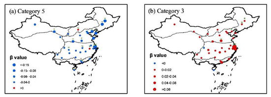 The increase in days under no thermal stress mainly occurred in the spring and autumn. In summer, the days under no thermal stress did decease (Figure 8a). Without consideration of the radiation effect on UTCI, Yan et al. [10] also believed that days under no thermal stress have been decreasing in most locations of China from 1961 to 2016 in summer. In contrast to the decrease in days under no thermal stress, the days under strong heat stress showed an increasing trend in most tourism cities in summer (Figure 8b), which would inevitably cause more potential heat threats to the public health and make the further investigation on thermal perception essential and urgent [28].