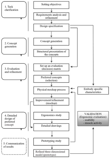 A bespoke design method was developed and applied to support attaining the goals set forth for the present study (Figure 1). A task clarification was accomplished through the activities of product goals definition (objectives), analysis and definition of product requirements, and the setting up of the product specifications with support from a literature review. Concept generation was attained by means of sketches and, mainly, the execution of mockups, leading to a structured presentation of alternative concepts. The evaluation and refinement stage involved the definition of an evaluation (decision) matrix derived from the specification, leading to the selection of the best concepts following the previously implemented criteria, and improvement and refinement of the physical mockups (embodying specific characteristics from specification stage). Four models (variants) were proposed based on the specifications, and full-scale mockups were made to apply the assessment matrix. As a result, two fully functional models were developed and prototyped. The detailed design stage was conducted in view of prototyping, as well as ergonomic assessment and usability evaluation. The generic operational model for product design proposed by Hales [11], reviewed by Lewis and Bonolo [12], and cited by Coelho [13] was adopted as a reference. In an industrial design context, the subordinate processes are divided into five phases: (1) task clarification; (2) concept generation; (3) evaluation and refinement (of concepts); (4) detailed design (of the preferred concept); and (5) communication of results (through the refined prototype). However, the main goal throughout this design process was to attain appropriate physical prototypes for comparative ergonomic evaluation (validation). Hence, some adaptations were undertaken from the reference operational model (Figure 1). In this regard, subordinate processes 3 (evaluation and refinement) and 4 (detail design) were grouped. Moreover, the study on the production processes is not reported in this document, as well as subordinate process 5 (communication of results), as it is assumed to be out of context within the scope of this manuscript, focusing on the design with the goal of performing the product evaluation emphasizing the detailed ergonomic study. Thus, the development of functional prototypes occurred upstream of the communication of results, since these were indispensable to the ergonomic study, which included studies of usability and muscle activity of the participants.