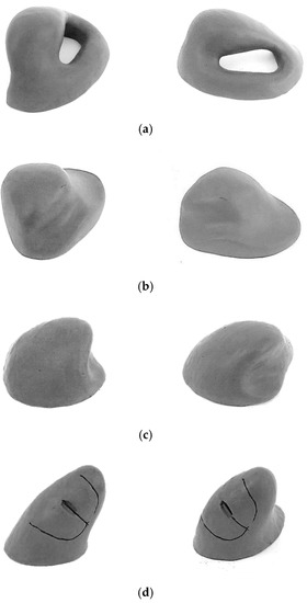 In the conceptual stage, potential concepts were generated as solutions to the previously specified problem, through a set of creative tasks based on the specification presented in Table 1. Although this method may seem reductive from the point of view of the creative process inherent to the generation of concepts compared to the 2D sketch, it was possible to generate distinct 3D geometries. The four generated concepts are presented in Figure 2 as viewed from four alternative perspectives. In this stage, an attempt was made to incorporate the characteristics (requirements) necessary to fulfill the specifications, establishing compromises in the satisfaction of conflicting requirements, through shape solutions. Examples of requirements/recommendations that revealed to be conflicted were: providing grip surfaces of sufficient size and shape to prevent slipping, providing a support to the palm of the hand, providing finger anchoring to ease the movement of the pointing device with less effort of the fingers, promoting a close distance between distal ends of the index finger and thumb (precision grip), promoting postures in which the adjacent fingers (middle finger, ring finger, and pinky) do not assume different positions from each other, creating innovative aesthetic shapes, among others. The new shapes were manually generated using modeling technics with clay [25]. This material allows for easy manual modeling when slightly heated. Despite the lack of mechanical and electronic functions related with the use of the (nonexistent) functional buttons, the use of these primary models enabled the accomplishment of preliminary tests, related to form and functional movement of the solid object. Several aspects related to the postures of the hand fingers, hand–palm support, and anchoring could be tested. It was thus possible to generate new refined solid geometries, adapted to the anatomy of the hand, despite the difficulties that this task imposed [17] due to the differences between men and women’s anatomy and anthropometry.