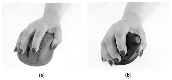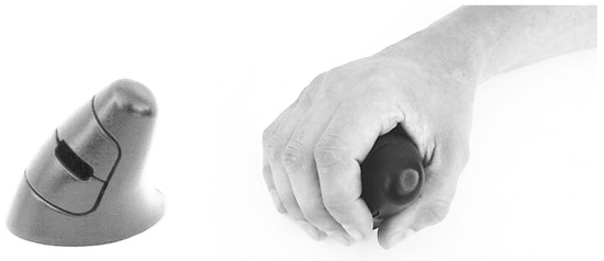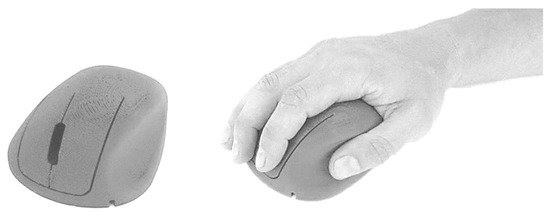 - Odell, D.L.; Johnson, P.W. Evaluation of a Mouse Designed to Improve Posture and Comfort. In Proceedings of the 8th International Conference Work with Computing Systems WWCS 2007-International Ergonomics Association, Stockholm, Sweden, 21–24 May 2007. [Google Scholar]